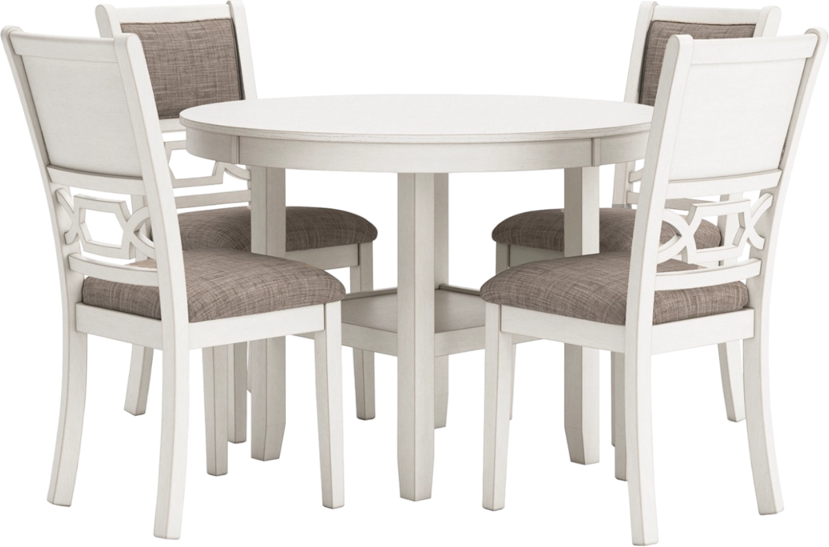 Come together for a delightful dining experience. Chic and relaxed, this dining table and chair set effortlessly captivates with its elegant simplicity. The timeless design pairs a crisp white hue with gray textured upholstery. It's a fresh addition everyone will notice.Read More