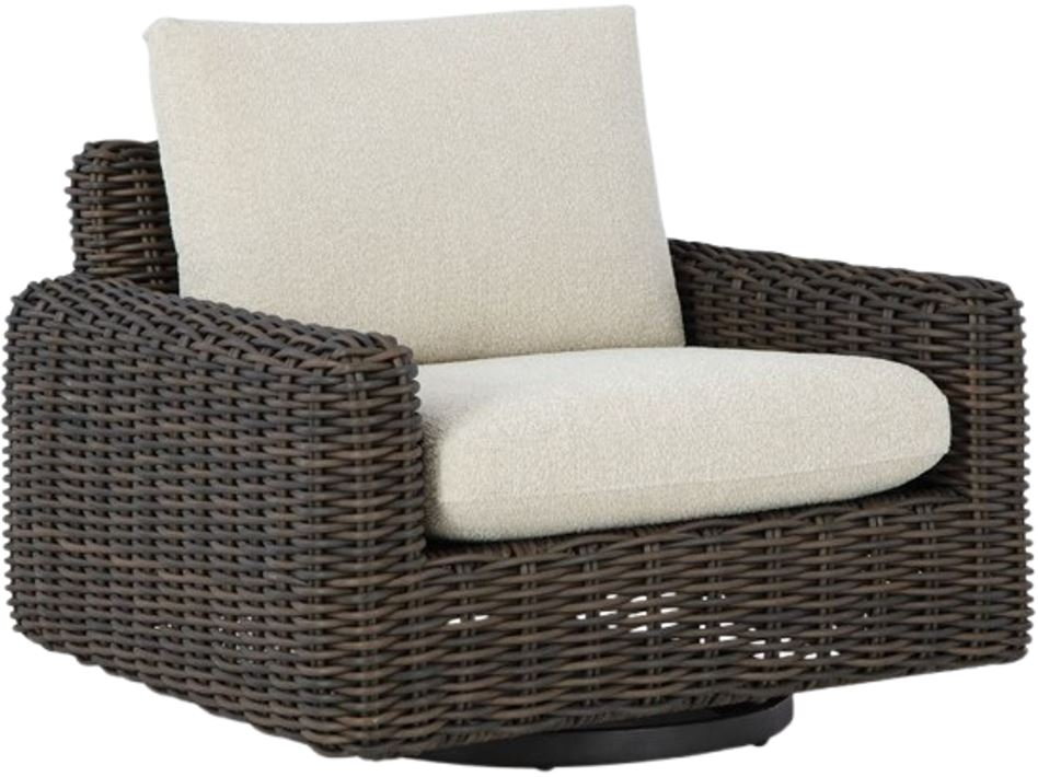Add luxury, comfort and durability to alfresco fun. This outdoor swivel glider lounge chair captures the textural beauty of wicker while withstanding the elements, from rain to shine. With a UV-resistant design, the wonderfully low-maintenance Nuvella+™ fabric maintains its good looks over time.Read More
