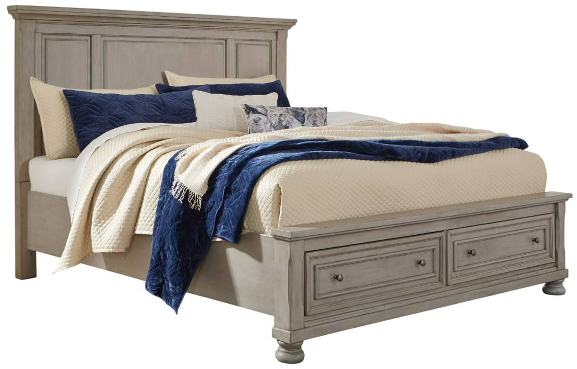 Includes California King panel headboard, storage footboard, and rails with roll slats